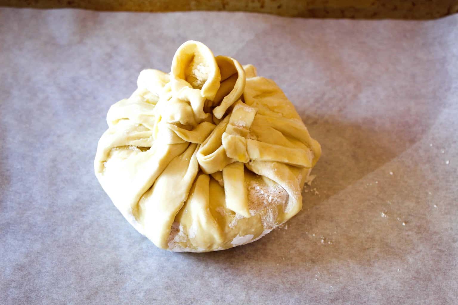 - Gently pull the sides of the dough up over the cheese; work around the brie, bringing up the sides of the dough; pinch the dough together on top