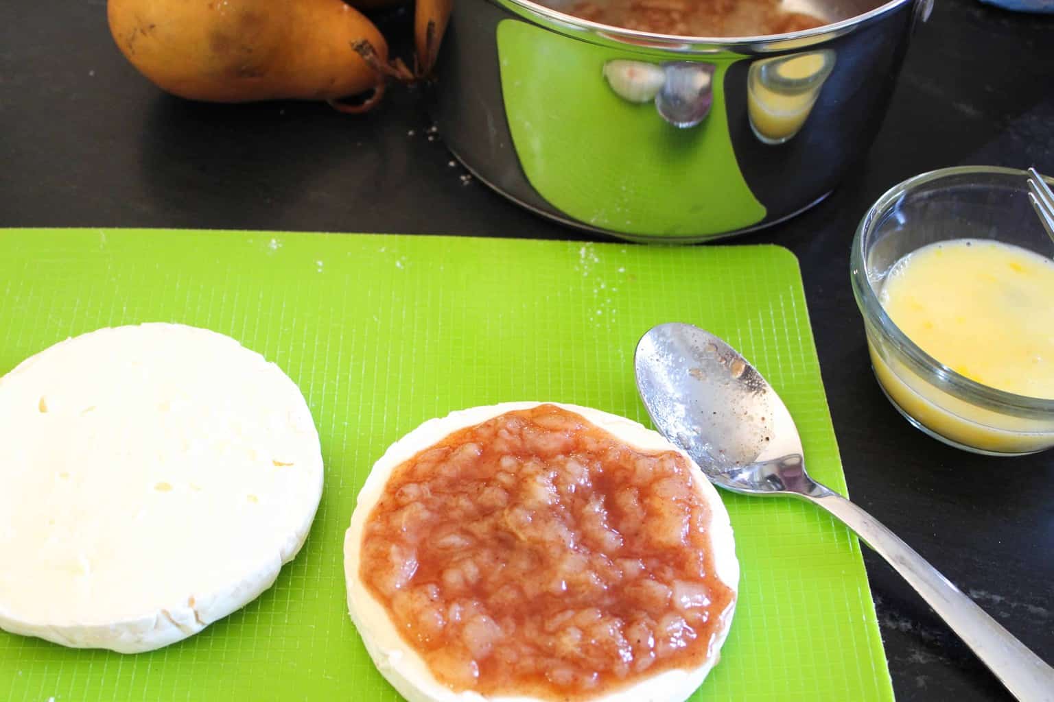 Refrigerate the pear compote and apply it to the wheel of brie while it’s cool. Why? This ensures your brie en croute pear filling won’t seep out