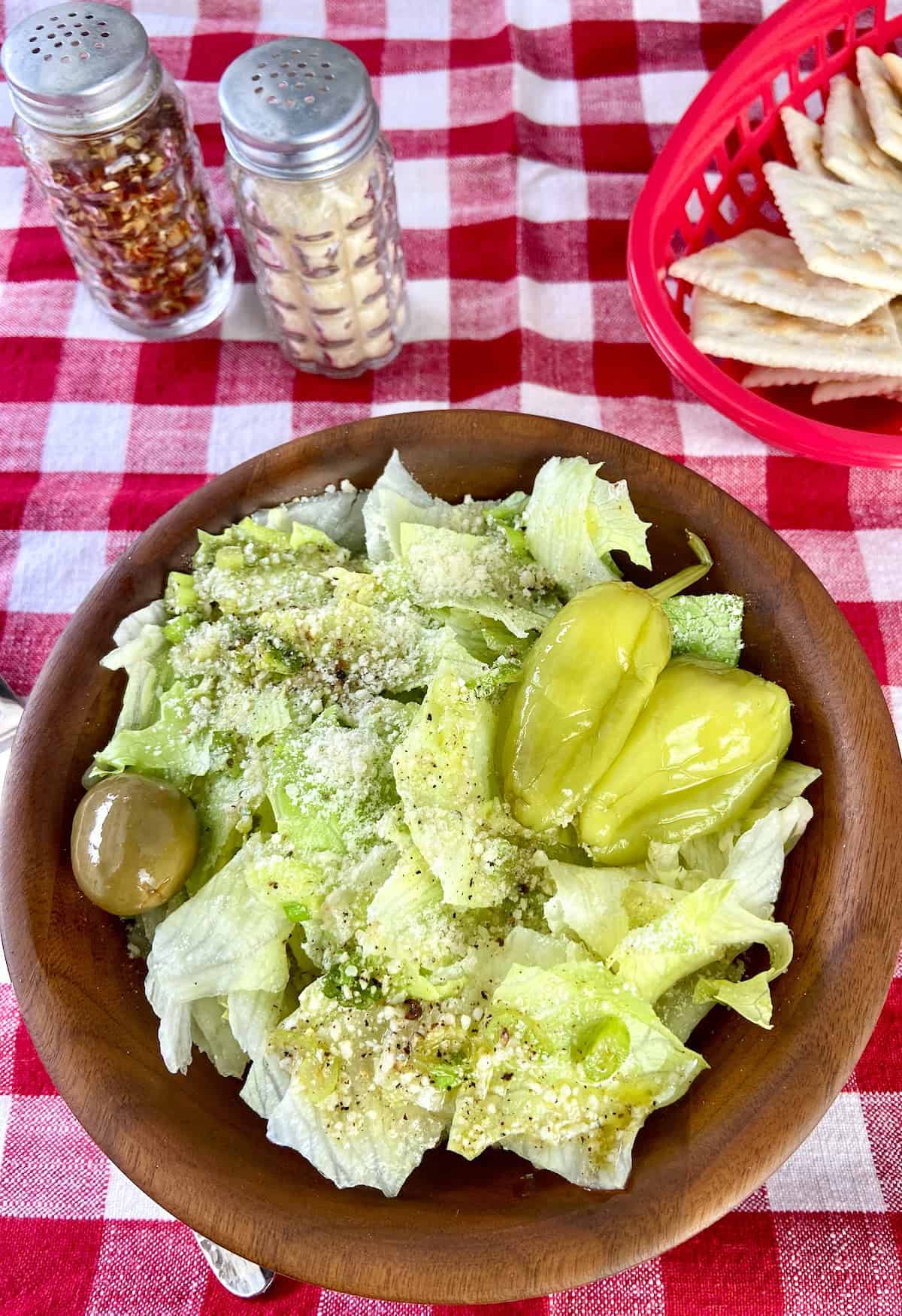 The Campisi’s house sald is simple. Torn iceburg lettuce topped with their famous Italian salad dresssing and garnished with an olive and a pepperoncini pepper (some folks call them banana peppers.)