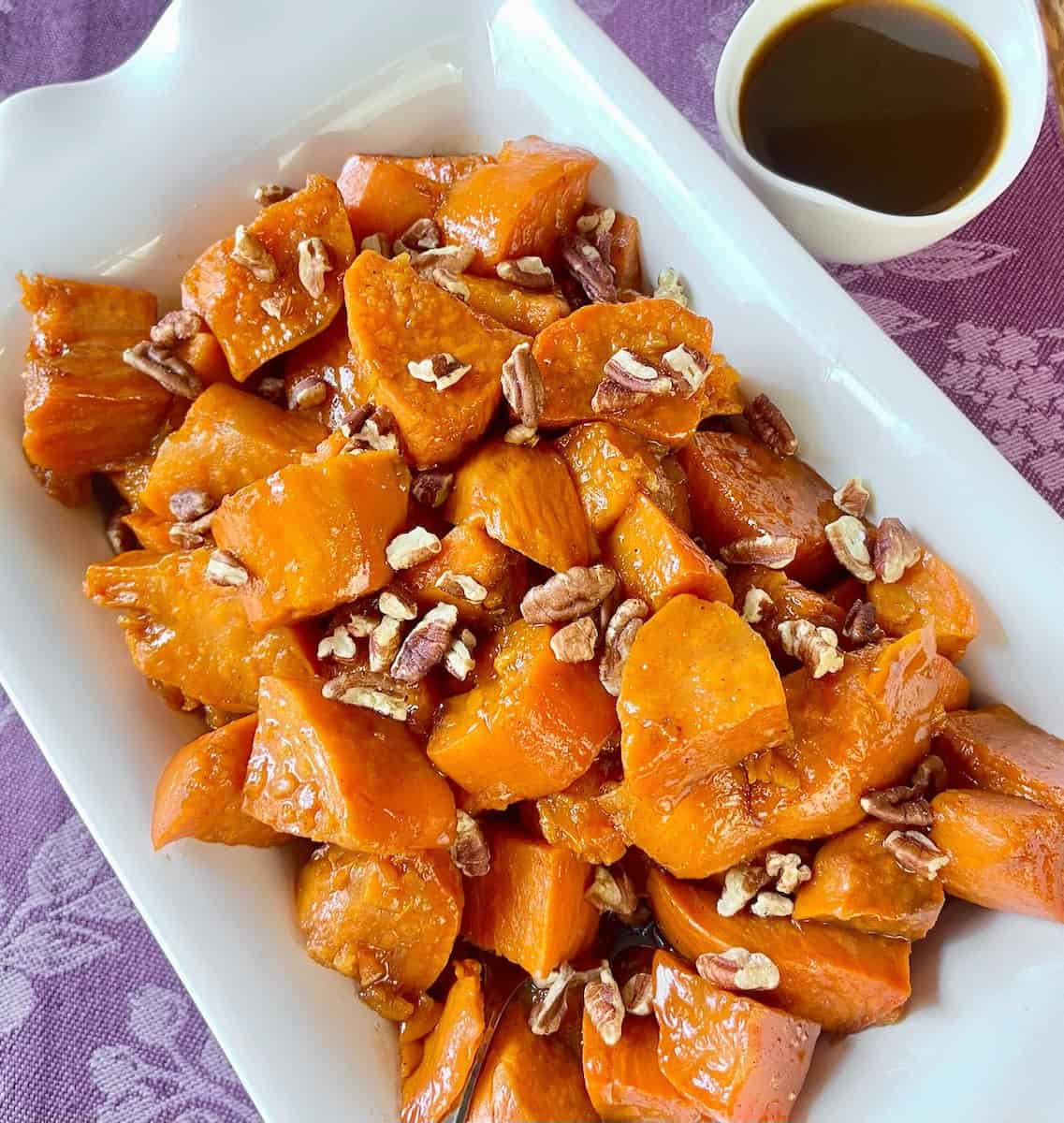 You’ll love this Southern, old fashioned Candied Sweet Potato recipe! Tender sweet potatoes nestled in a buttery, sugary glaze and topped with chopped pecans. Make it on the stovetop, bake in the oven or put it in the slow cooker – however you make it, it only requires one pot! Easy clean up and delicious! Perfect as a Thanksgiving side dish or any time of the year!