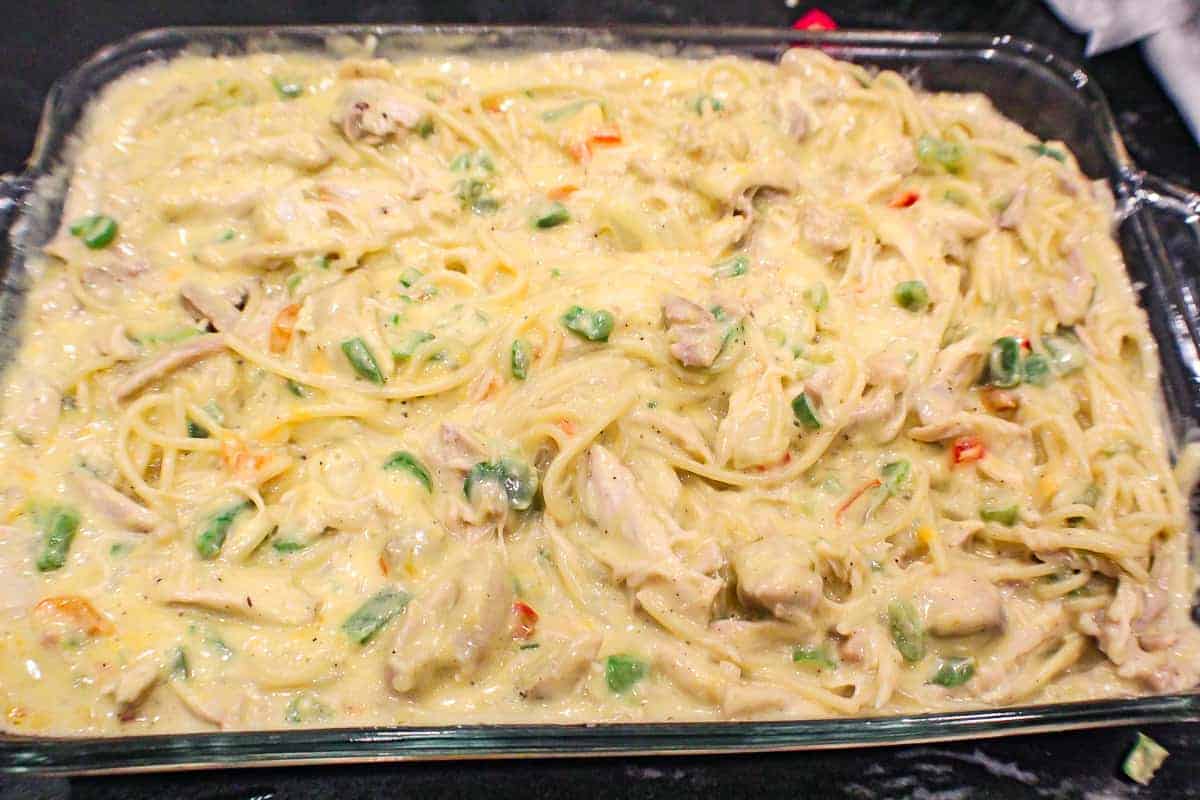 Creamy spaghetti noodles nestled in a cheese sauce with tender chicken and hints of red and green bell peppers! This casserole is ready in less than an hour.