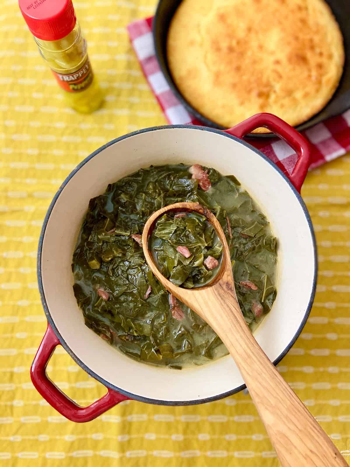 Serve your leafy green vegetable with a slotted spoon or tongs. I always put a second serving spoon in the bowl in case anyone wants to get a little of that savory pot likker for their serving!