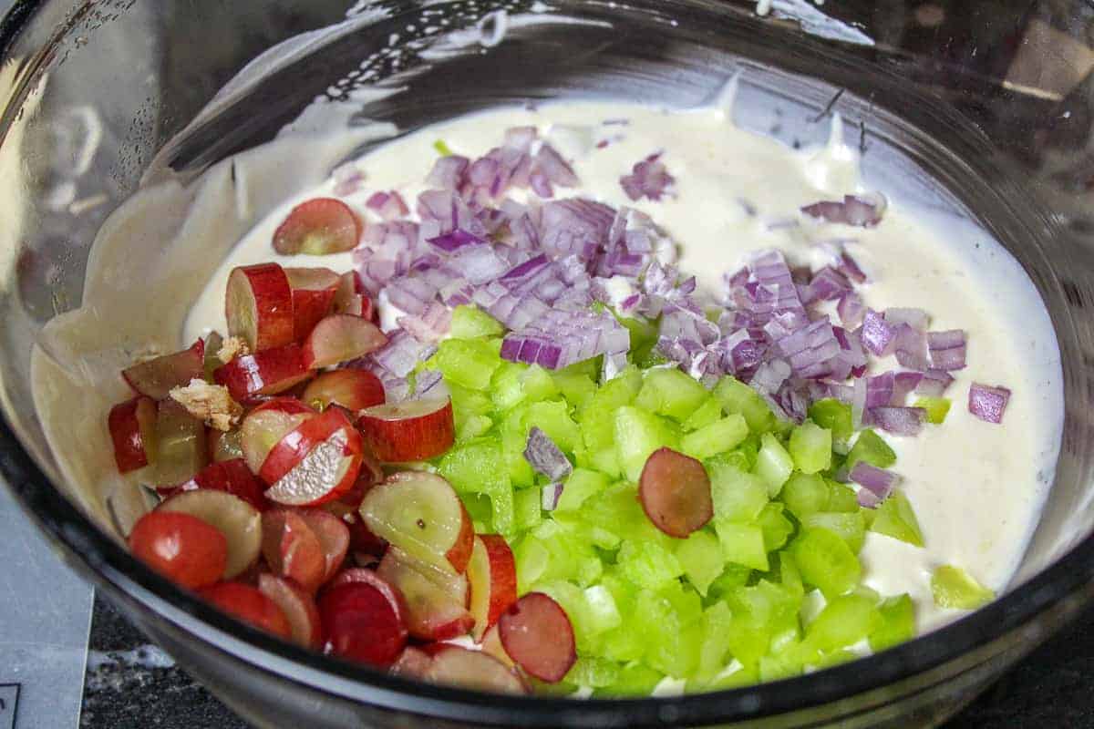 - Add onion, celery, grapes and meat to sauce; combine well½ cup diced red onion, ¼ cup chopped celery, 14-16 chopped red grapes, 1½ -2 lbs. smoked turkey or chicken (see Recipe Notes: Smoke)