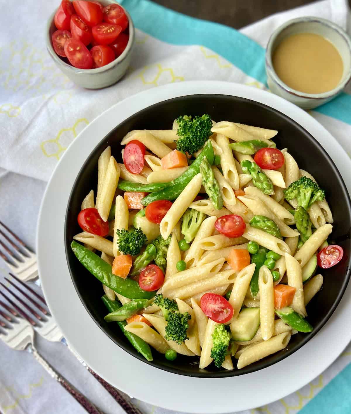 Traditionally, Pasta primavera consists of pasta and assorted spring vegetables with a light cream sauce, but this recipe uses a dairy-free dressing that doesn’t over power the flavors of the vegetables.
